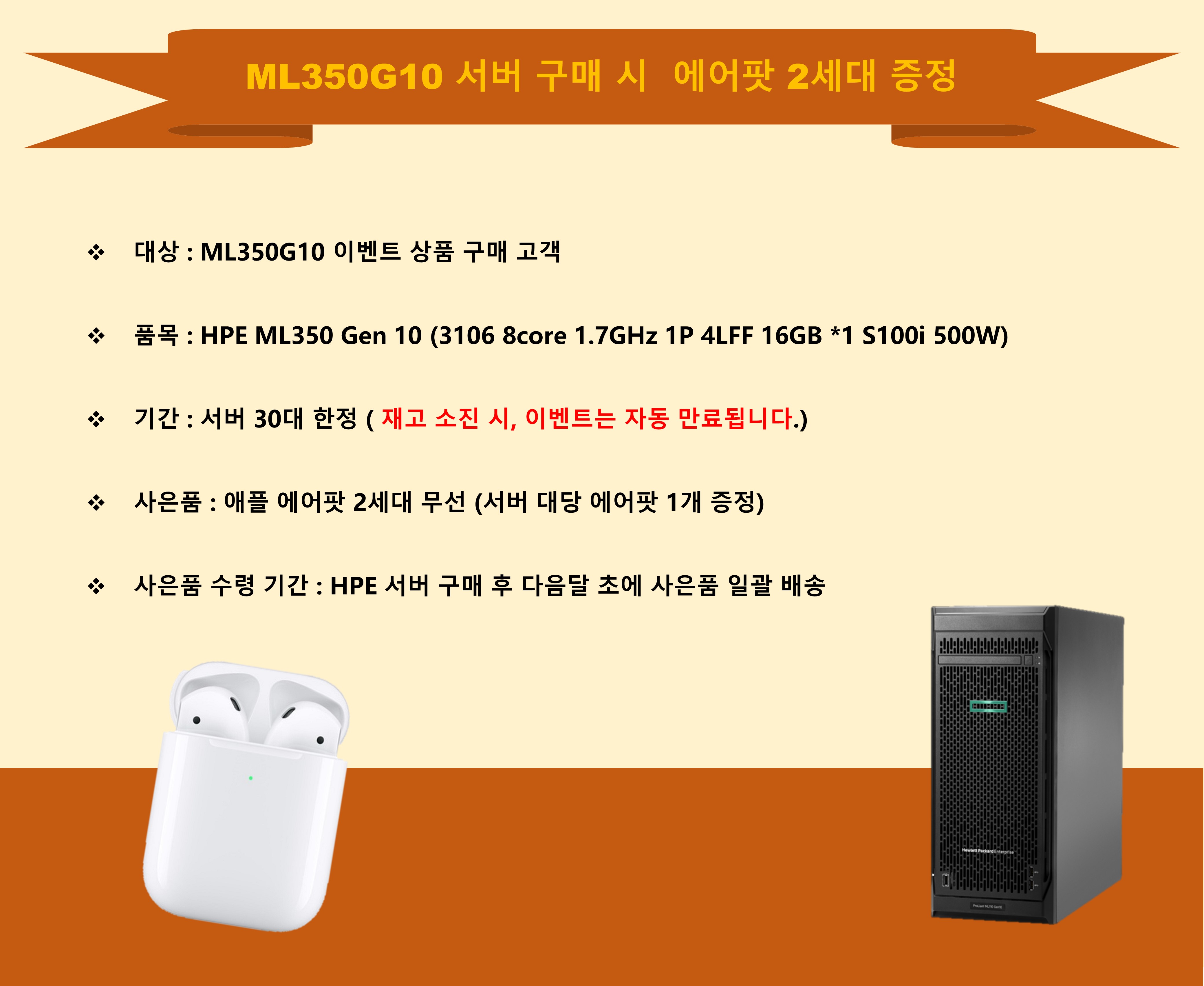 ML350G10(3106 모델) 서버를 구매시 에어팟 2세대(무선)을 증정해드립니다~