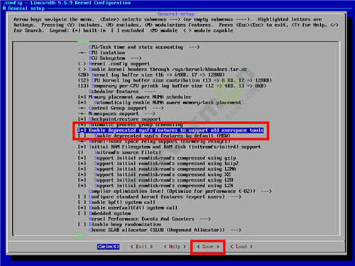menuconfig -> General Setup -> Enable deprecated sysfs features to support old userpace tools 선택 후 Save 저장