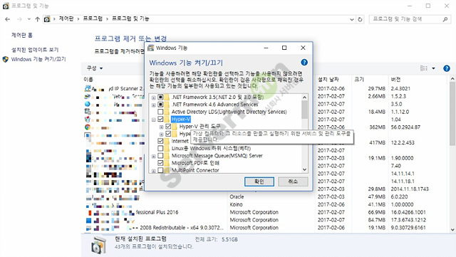 Hyper-v 역시 제어판에서 설정해야 합니다.
