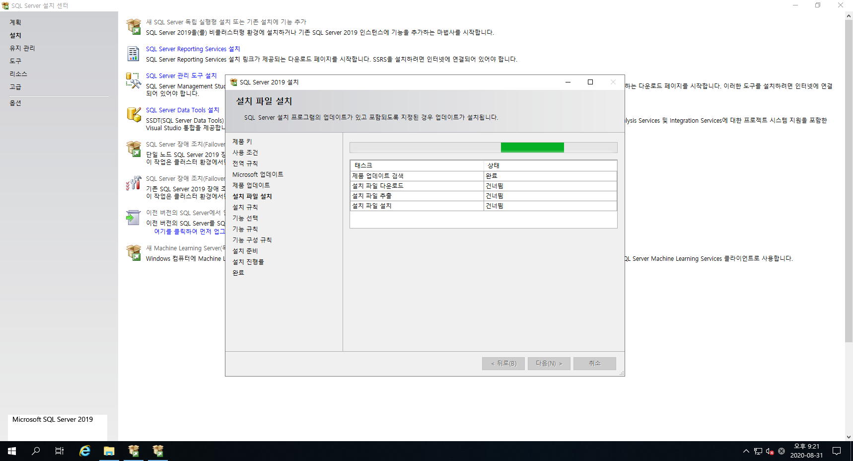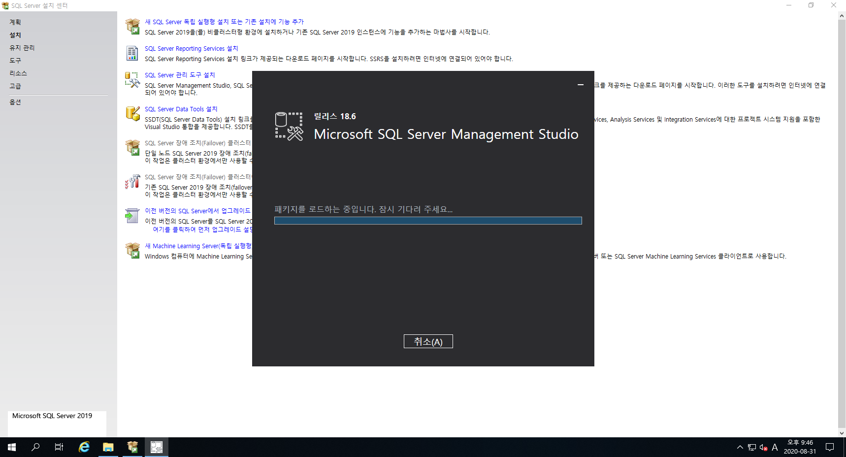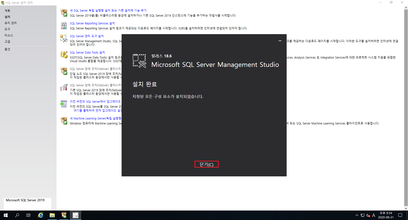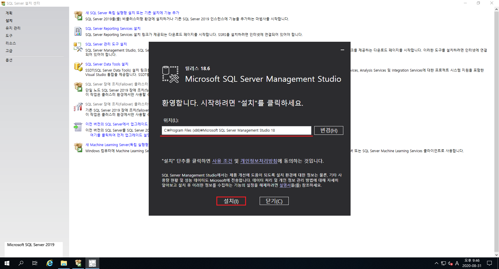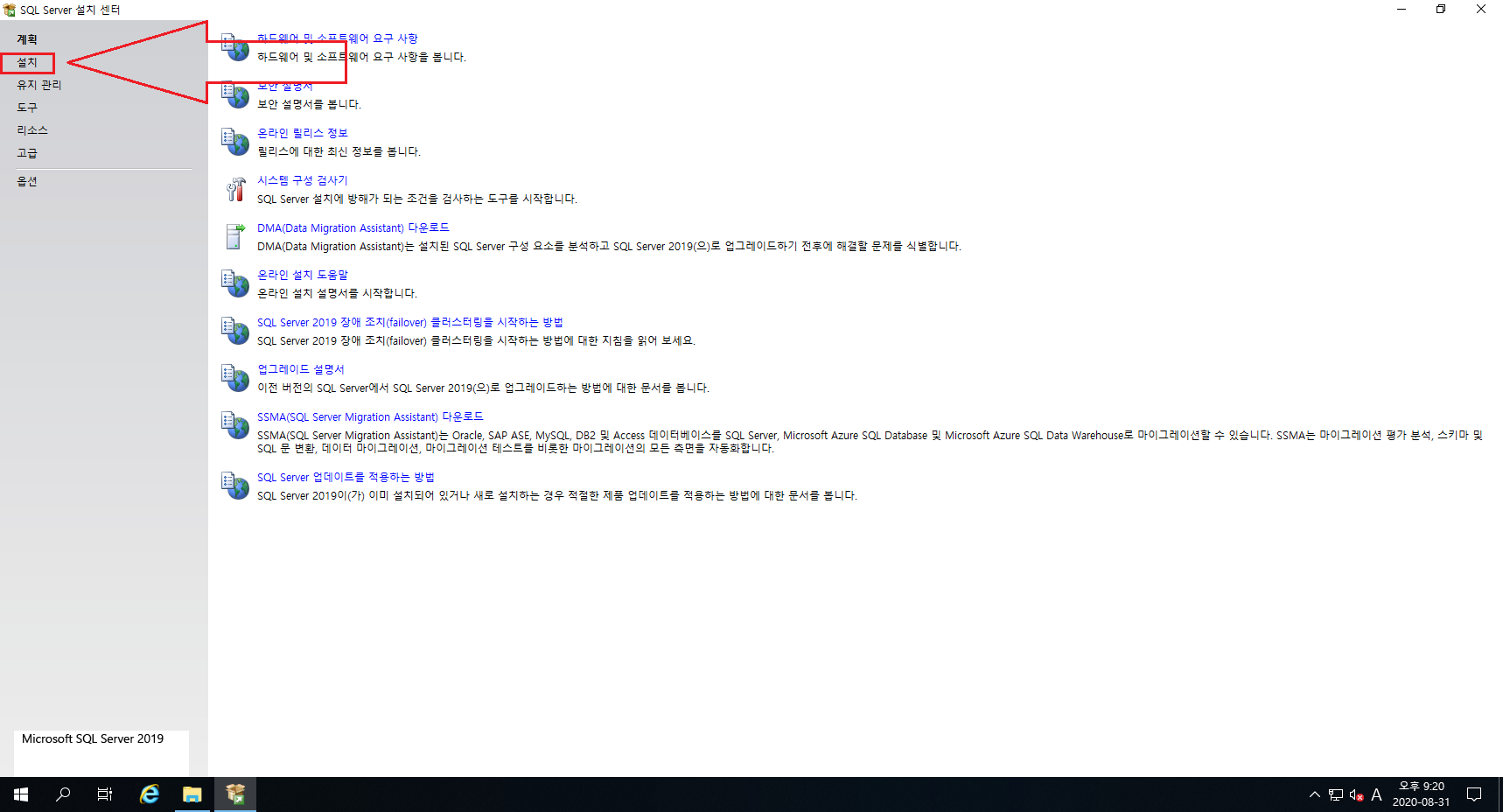 MS-SQL 2019를 실행하여 좌측 상단의 [설치]를 클릭합니다.