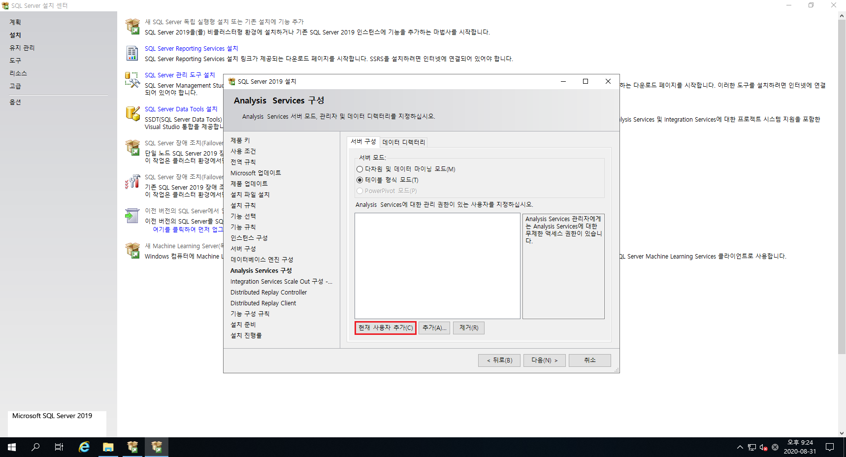 Analysis Services 구성단계 입니다. [현재 사용자 추가]를 클릭하여 사용자를 추가합니다.