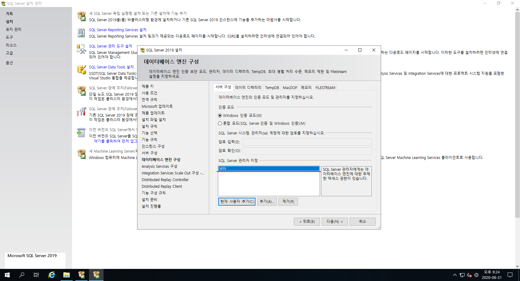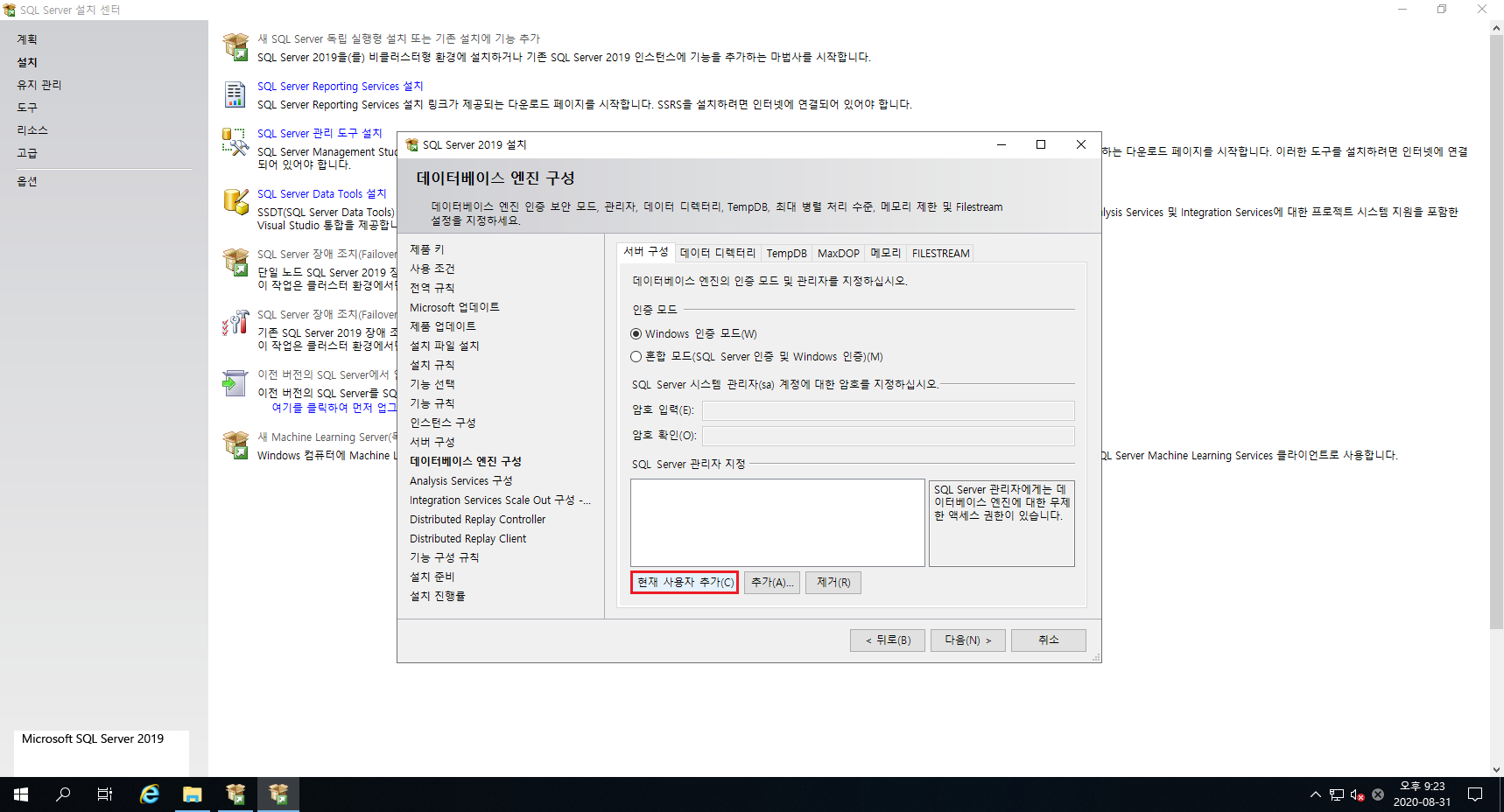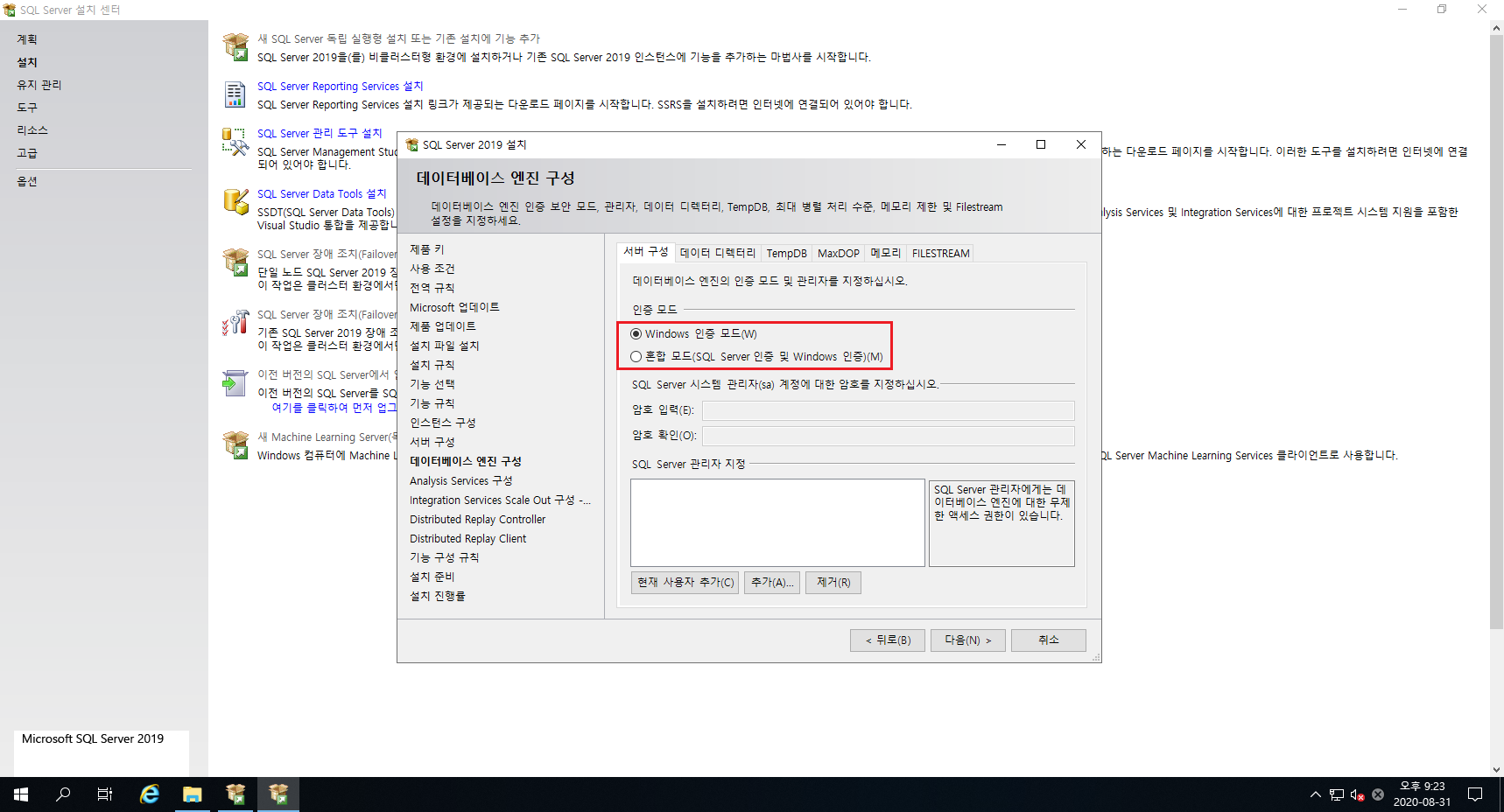 데이터베이스 엔진 구성단계 입니다. 인증모드를 선택합니다.