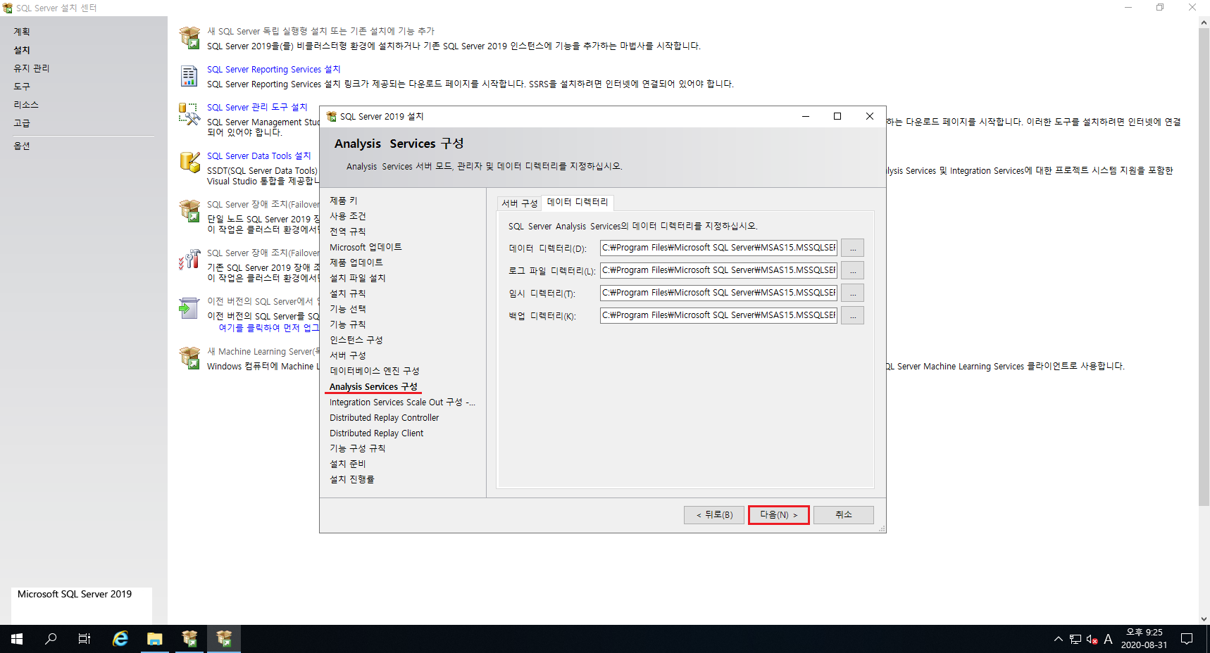 Analysis Services 구성의 데이터 디렉터리는 서버의 DB와 관계 없으므로 [다음]을 클릭합니다.