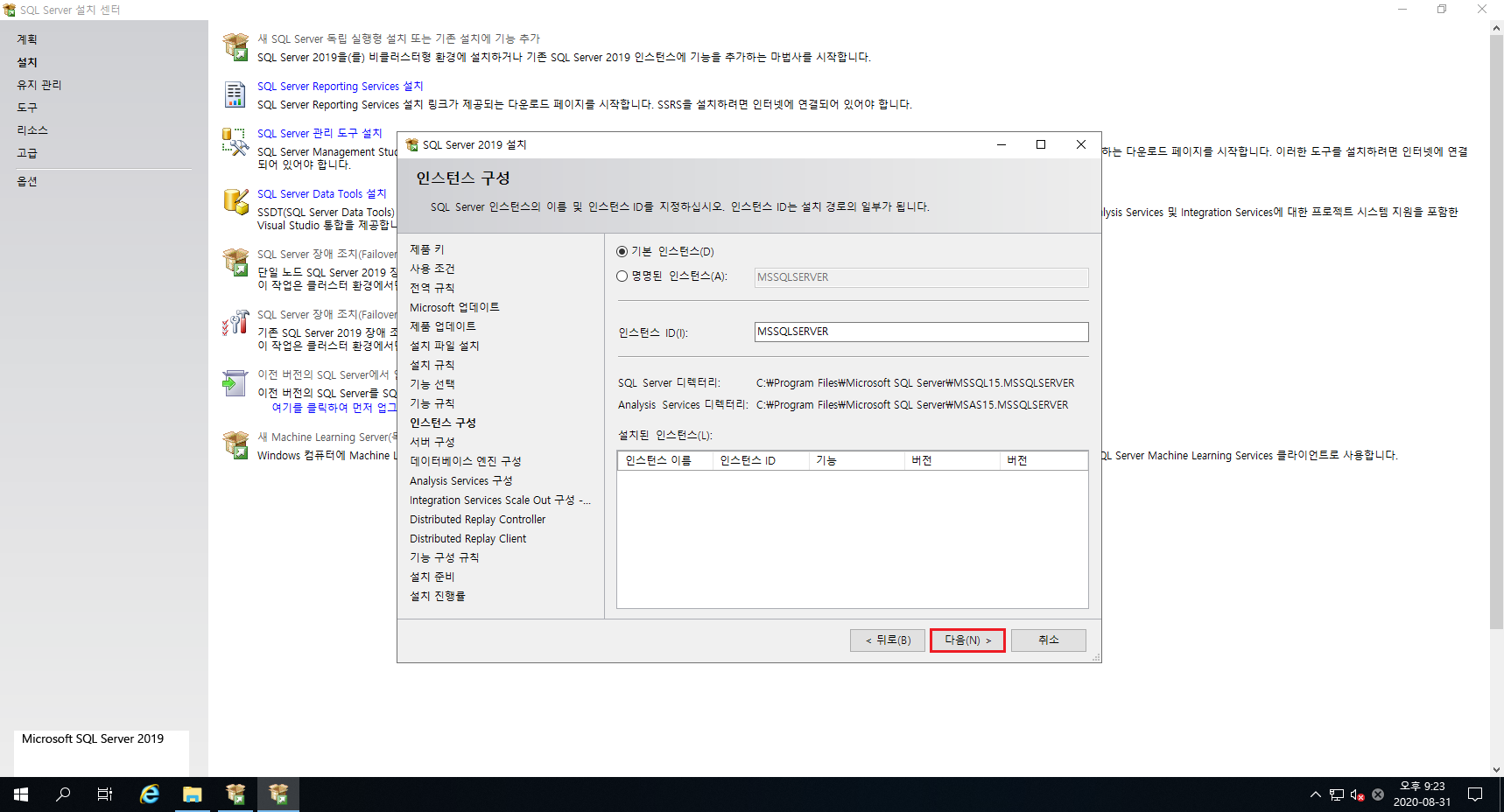 인스턴스 구성창이나, 기본적인 설치이므로 [다음]을 클릭합니다.