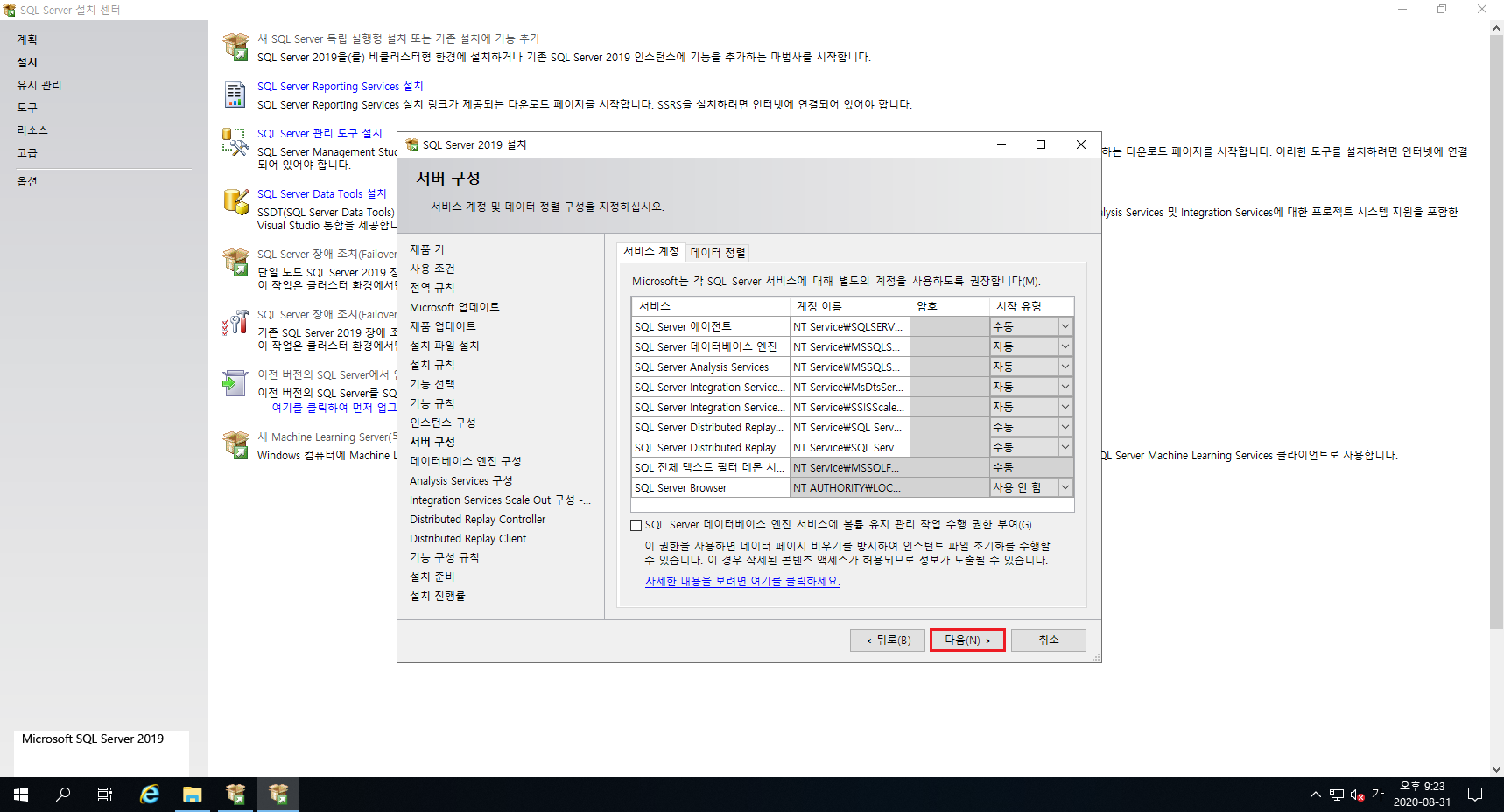 서버 구성단계이지만, 기본적인 설치를 할 것이므로 [다음]을 클릭합니다.