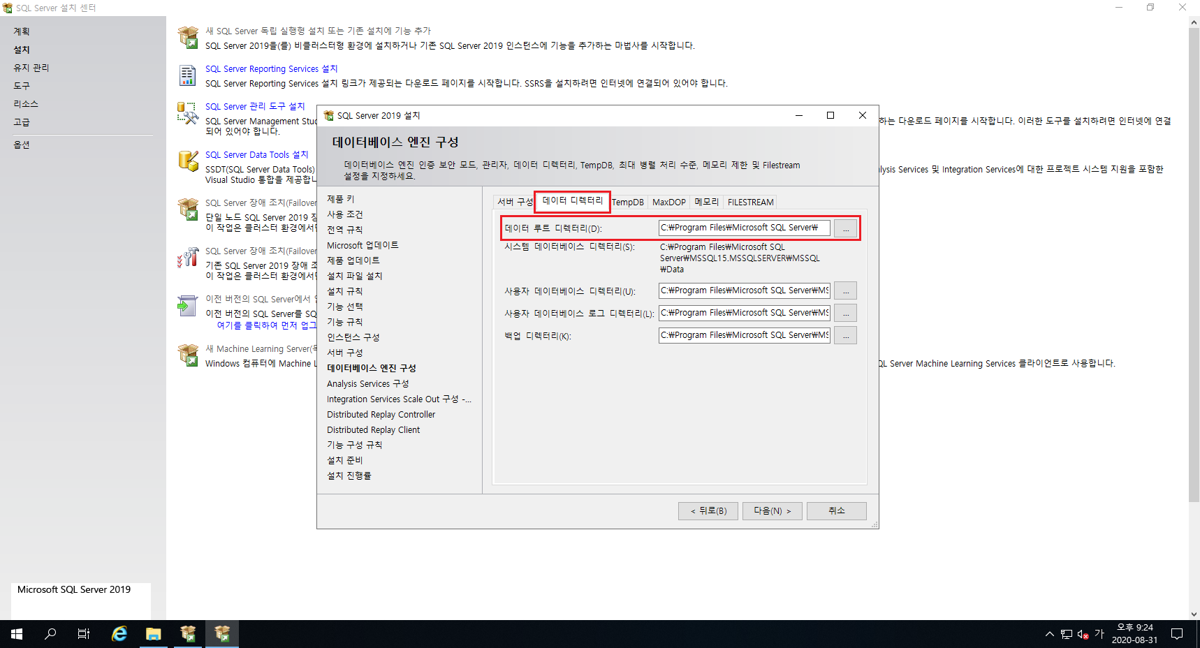 [데이터 디렉토리]탭을 클릭하여 이동하고, 데이터베이스의 경로를 지정합니다.