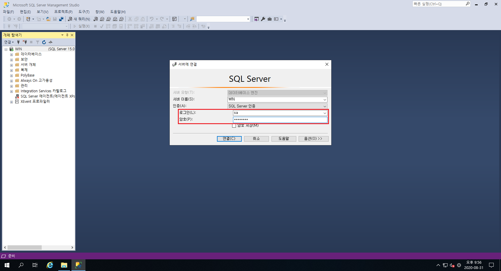 로그인에는 sa를 입력하고, 암호를 입력 후 [Enter]키를 누르거나 [연결]을 클릭합니다.