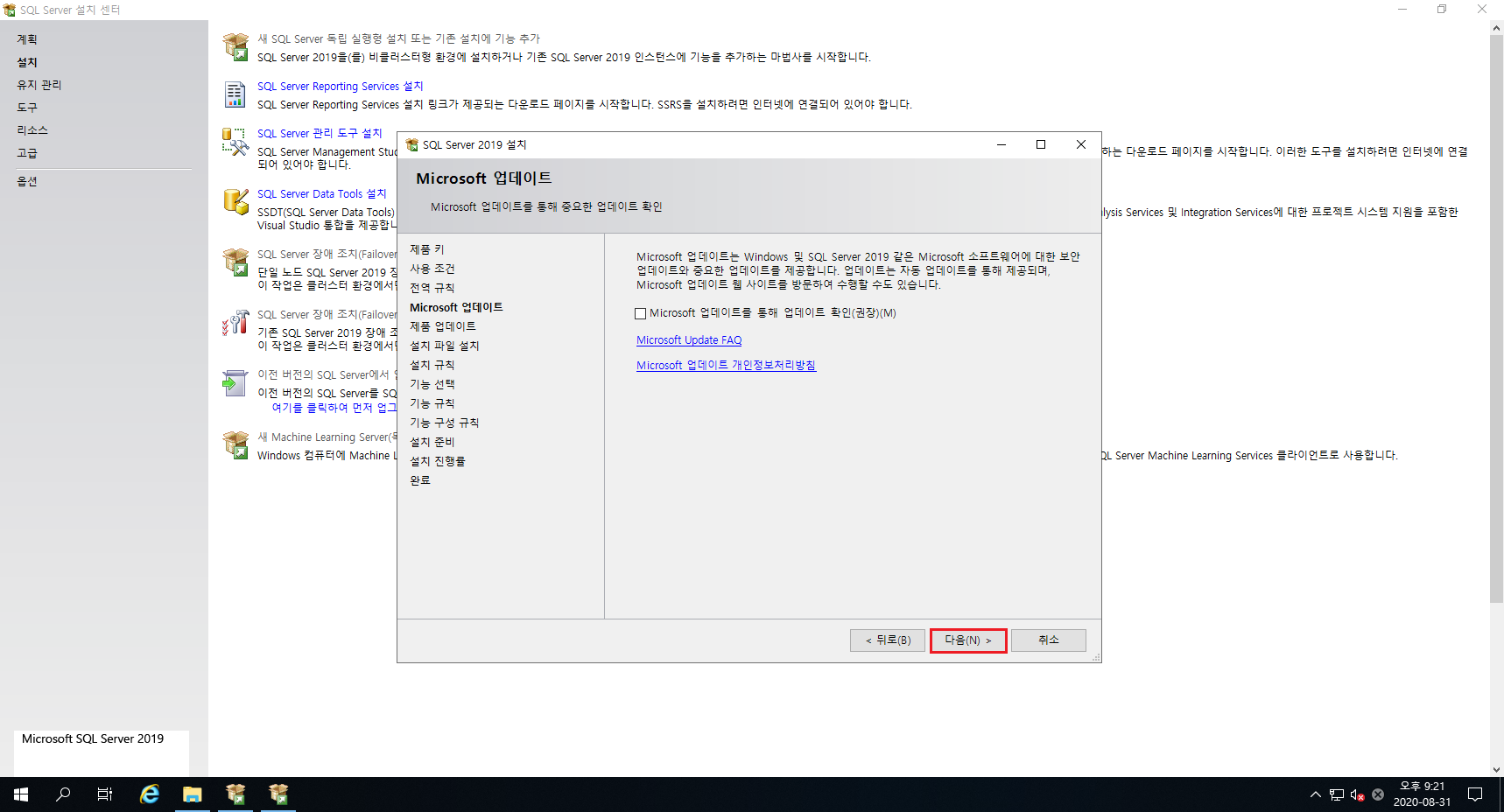 업데이트 여부를 사용환경에 따라 체크 후 [다음]을 클릭합니다.