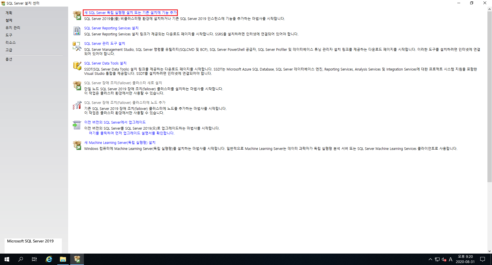 [새 SQL Server 독립 실행형 설치 또는 기존 설치에 기능 추가]를 클릭합니다.