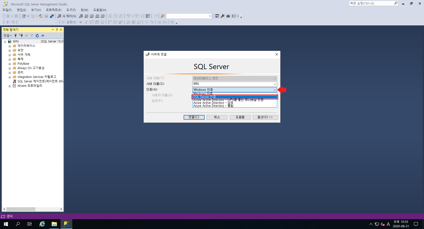[연결]을 클릭 후 [데이터베이스 엔진]을 클릭하면 인증 팝업창이 뜨며 추가로 로그인 인증을 할 수 있습니다.
