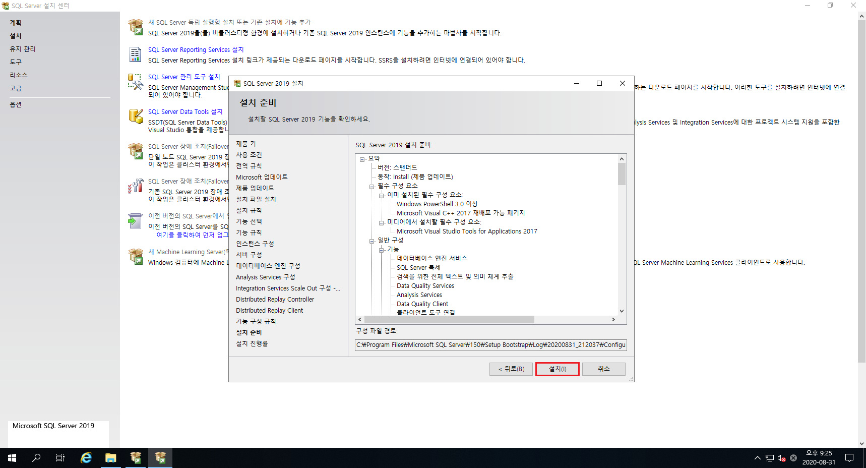 MS-SQL 2019를 실행하여 좌측 상단의 [설치]를 클릭합니다.
