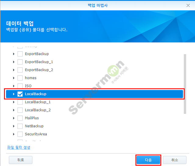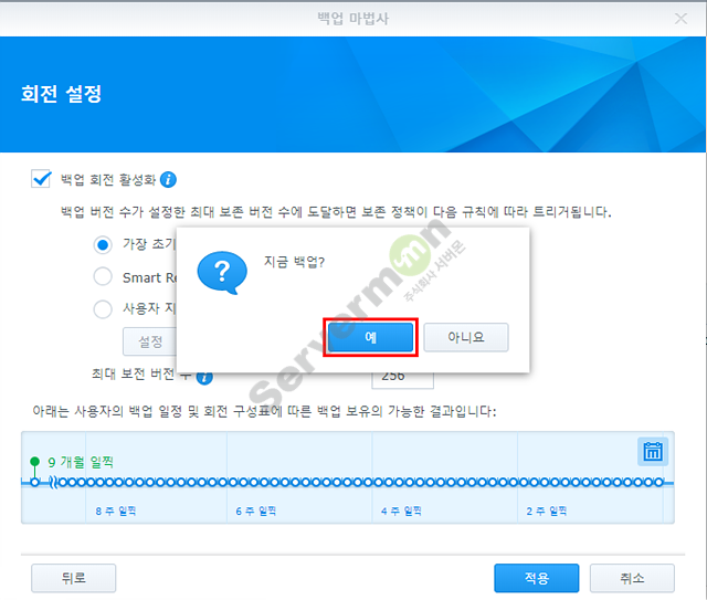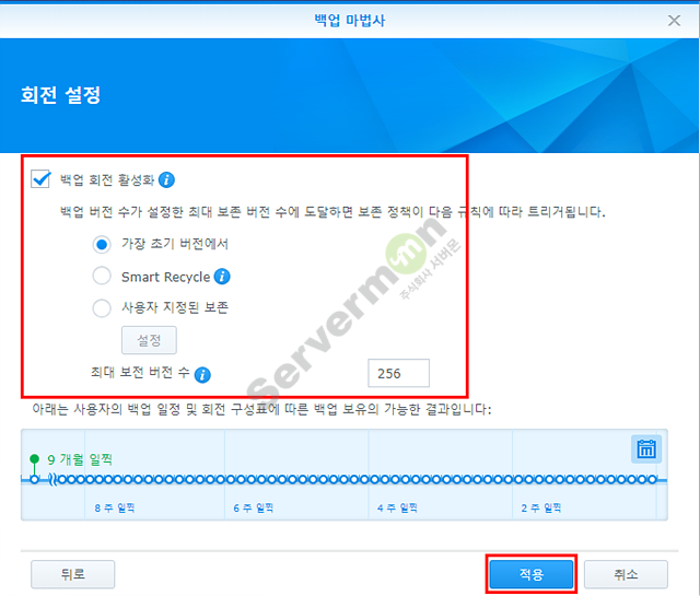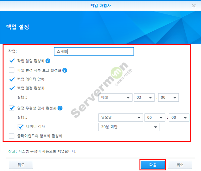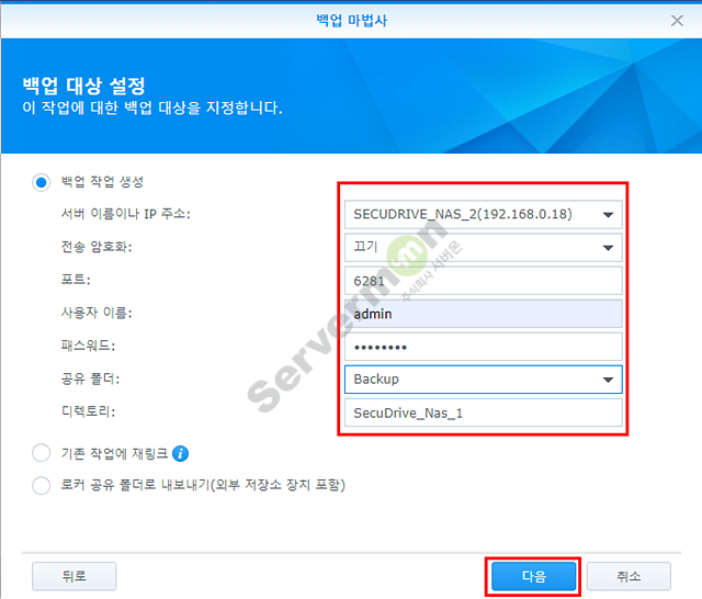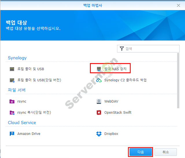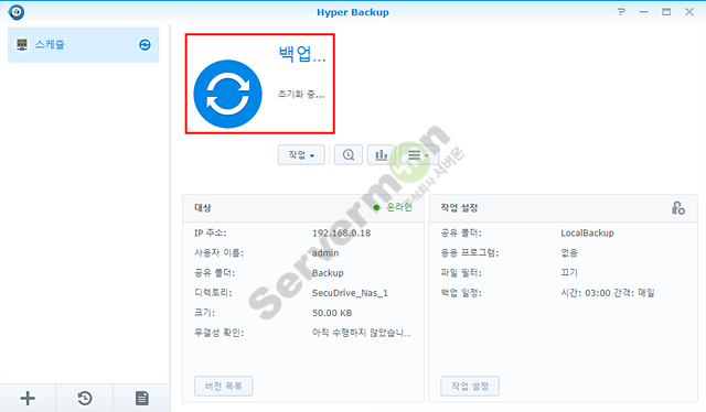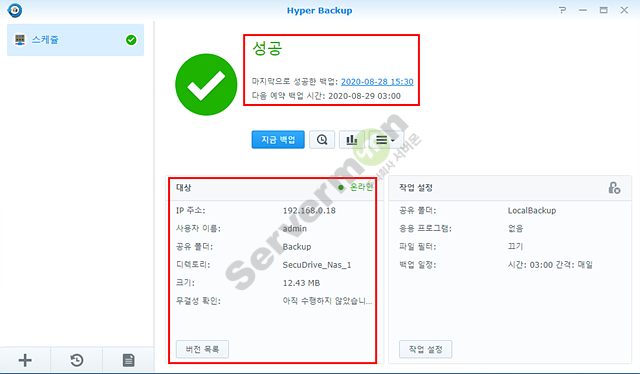 시놀로지 NAS의 경우 기본 제공하는 “Hyper Backup” 어플리케이션을 통하여 타 시놀로지 NAS에 백업 스케줄링이 가능 합니다.