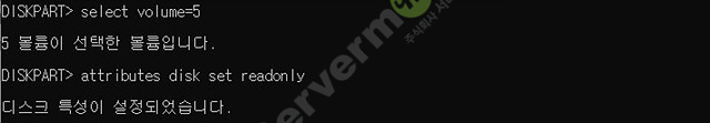 attributes disk set readonly 명령어를 입력하여 읽기 전용으로 설정합니다.