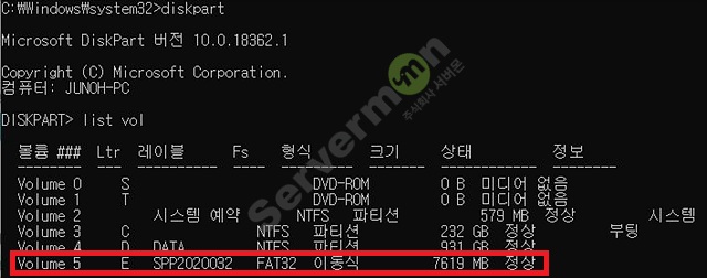 list vol 명령어를 입력 후 엔터를 눌러읽기 전용 설정할 볼륨 번호를 확인 합니다.