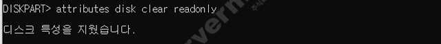 attributes disk clear readonly 명령어를 입력하여 읽기 옵션을 으로 제거합니다.