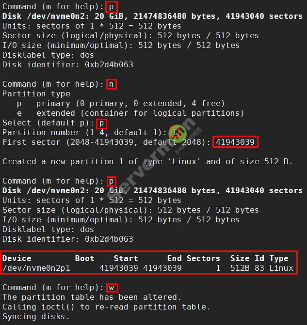 파티셔닝이 끝났으면 p로 잘 되었는지 확인해주고, w입력 후 fdisk를 마칩니다.