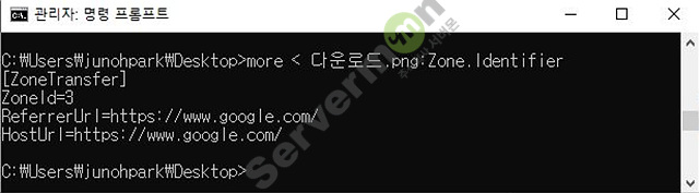 예를 들어 웹브라우저 에서 파일을 다운받은후 cmd 창에서 "more 파일명:Zone.Identifier" 와 같이 입력하면