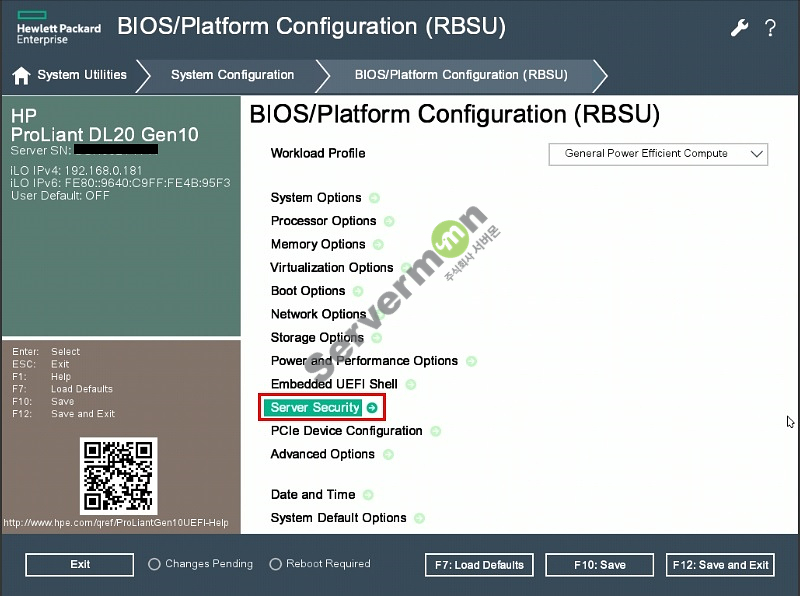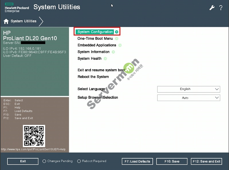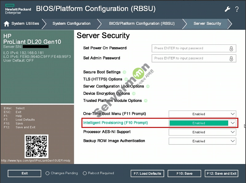 서버를 시작 후 F10 Intelligent Provisioning 메뉴가 보이지 않을때 BIOS에서 변경하는 방법입니다.