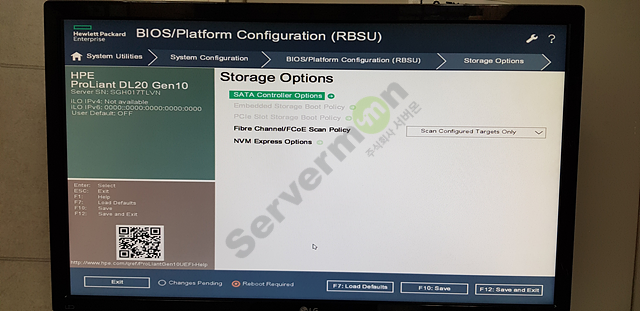 10. 하기 화면에서 모드를 “SATA AHCI Support Support”로 되어 있는 것을 “ Smart Array SW RAID Support”러 변경 후 “F12” 키를 눌러서 저장 후 BIOS에서 빠져 나옵니다.