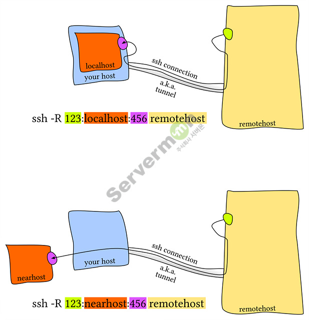 로컬 포트 포워딩과 달리 원격 포트 포워딩은 원격 서버의 연결을 로컬 서버로 포워딩하는 것을 목표로합니다.