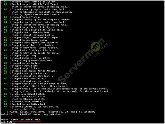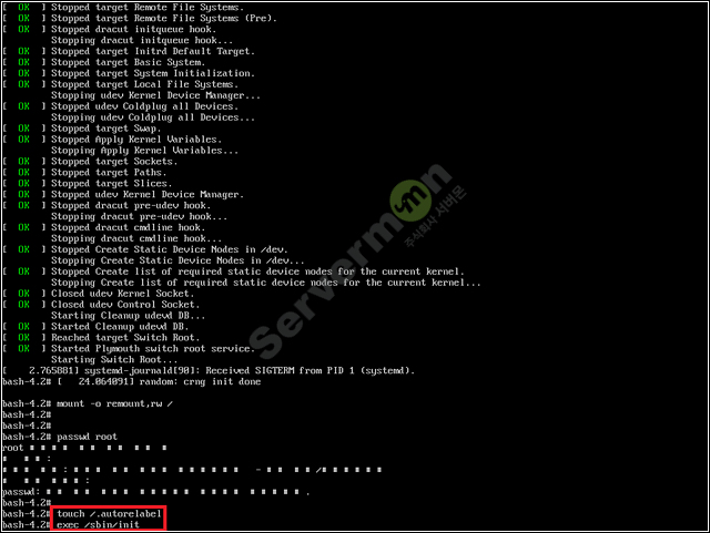 'touch /.autorelabel', 'exec /sbin/init'을 입력하여 재부팅합니다.