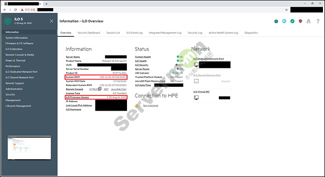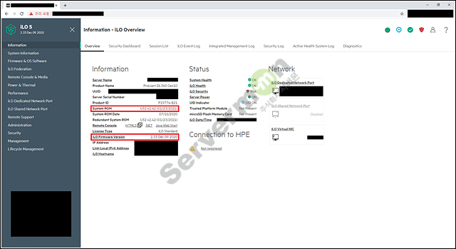 해당 화면에서 현재 System ROM과 iLO Firmware의 버전을 확인할 수 있습니다.
