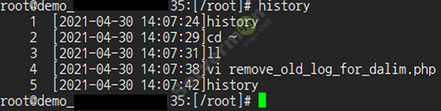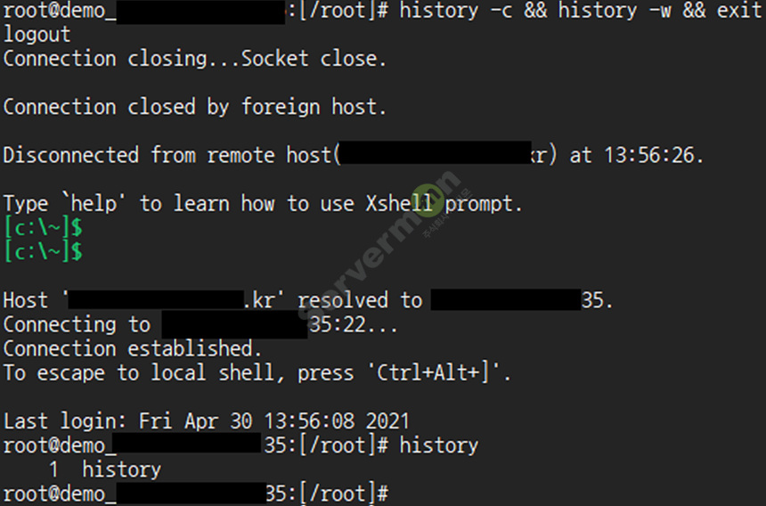 로그인 쉘 접속 후 , 세션에 저장된 명령어 히스토리 및 히스토리 파일에 저장된 명령어 기록 모두 삭제 됩니다.