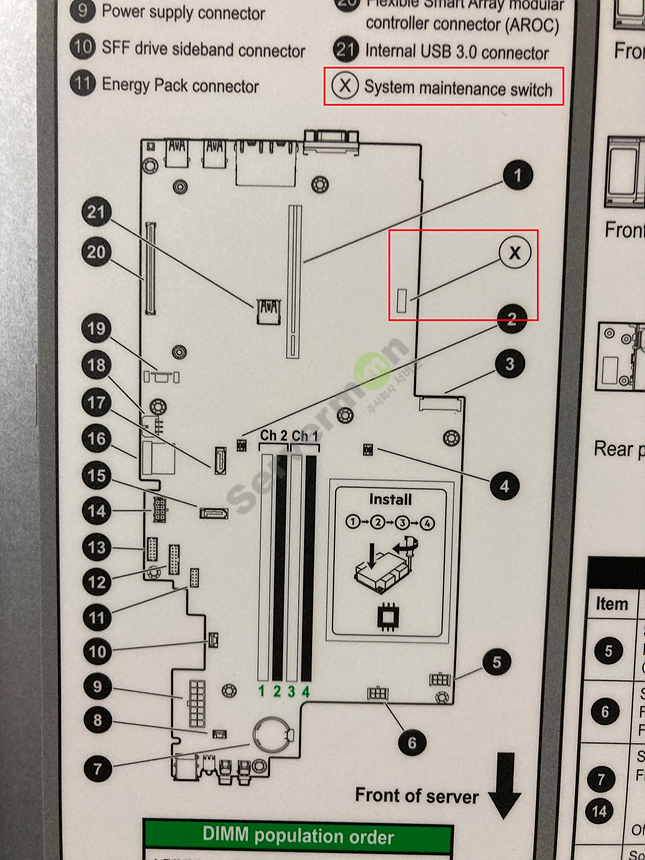 좌측 보드상의 위치를 나타낸 부분 중 System Maintence Switch를 나타내는 X표시가된 부분을 확인합니다.(System Maintence Switch의 위치는 서버마다 다를 수 있습니다.)