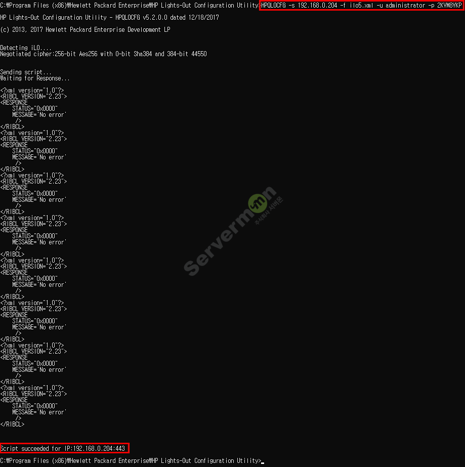 명령어) HPQLOCFG -s 서버ip -f 파일이름.xml -u administrator -p ilo패스워드