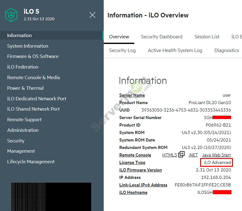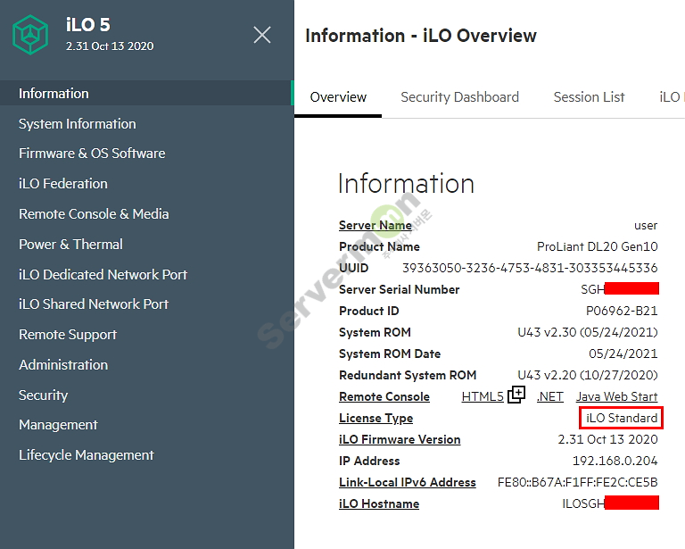 7. iLO 웹 페이지에 접속해서 확인 하면 iLO Standard로 변경 되어 있는 것을 확인 할 수 있습니다.