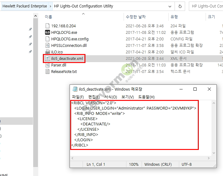 명령어) HPQLOCFG -s 서버ip -f 파일이름.xml -u administrator -p ilo패스워드