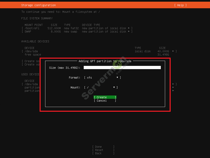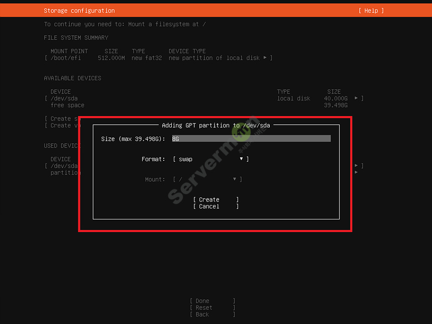 디스크에 시스템 영역인 root 파티션을 추가 합니다.