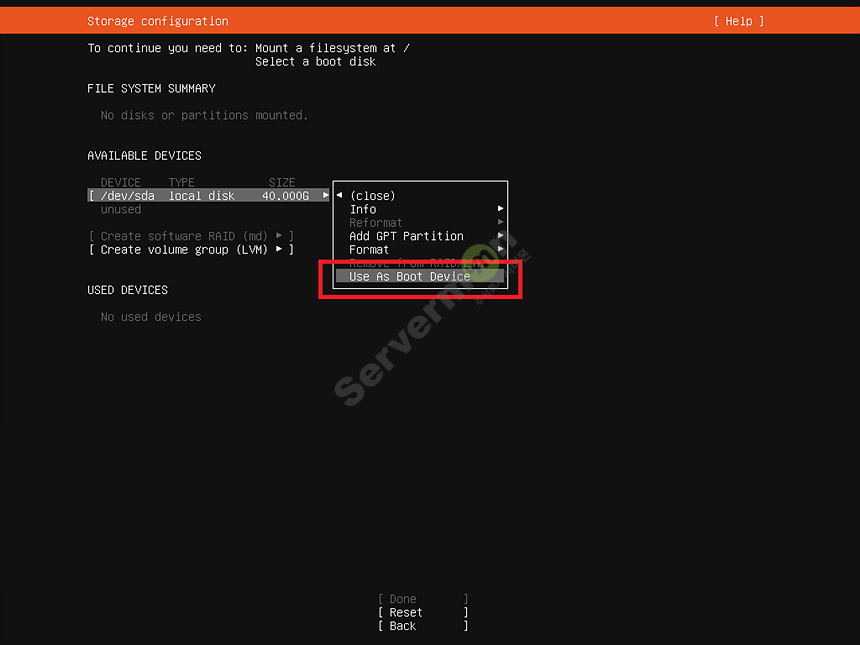 검색된 디스크의 부팅을 위하여 "Use As Boot Device" /boot/efi 영역을 할당 합니다.