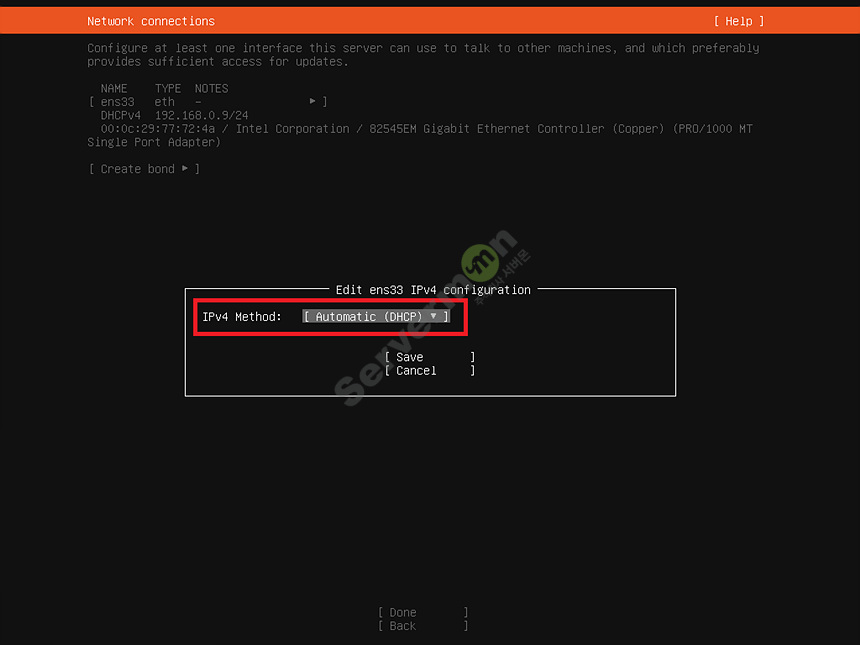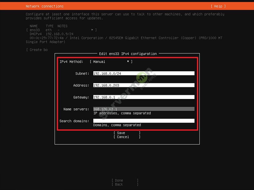 고정 IP 주소로 변경 하기 위해 Manual 로 변경 후 아래 양식에 맞게 입력 합니다.