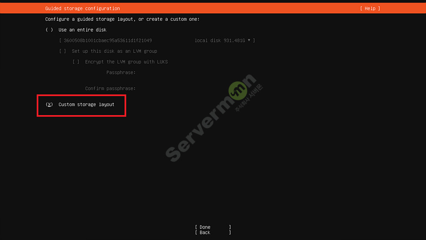 기본 값 사용시 LVM 기술을 사용하기 때문에 Custom storage layout 으로 진행 합니다.
