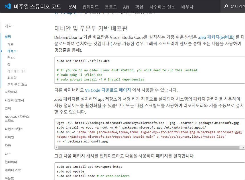 공식 홈페이지에 접속 하시면 OS별 설치 방법과 VScode에 관한 다양한 기술자료를 열람하실수 있습니다.
