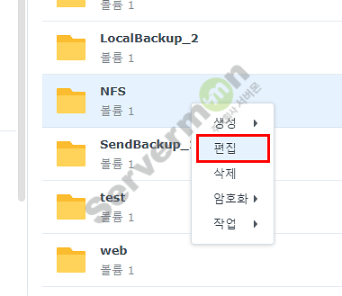 3. 생성한 공유 폴더에 NFS 권한 부여를 위해 생성된 폴더에 마우스 우 클릭 후 "편집"을 선택 합니다.