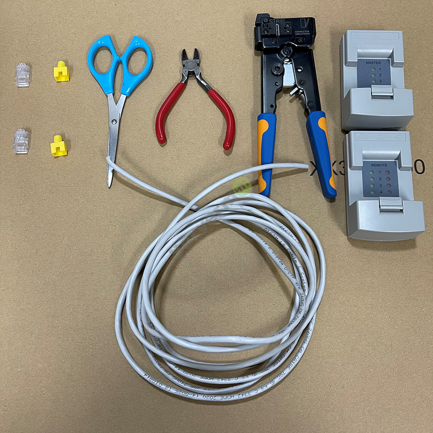 RJ45 커넥터, RJ45 보호캡, 가위, 니퍼, UTP 스트리퍼, 랜 케이블 테스터기, UTP 5E 랜케이블