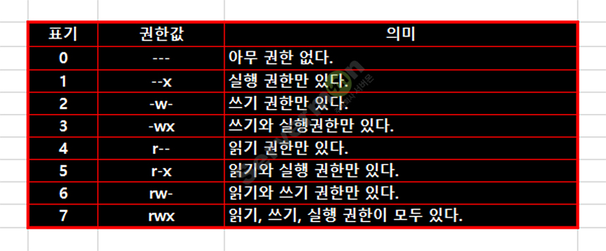 예를들어 'rwx'권한값은 [ r = 4 + w = 2 + x = 1 ]이므로, 합산하면 7이 됩니다.