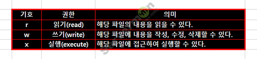 위 표와같이 리눅스의 권한 종류는 읽기, 쓰기, 실행 3가지가 있습니다.