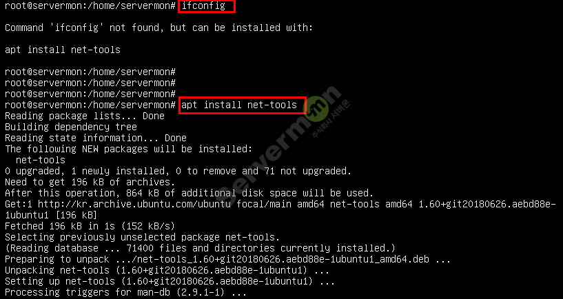 apt install net-tools 명령을 통하여 net-tools를 설치 합니다.