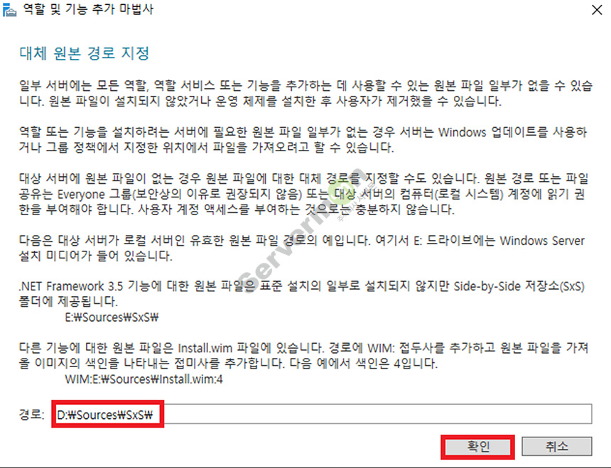 6. Windows Server 2019 설치 CD 내의 Source\SxS 경로를 지정해줍니다.
