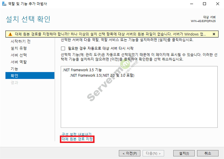 5. 온라인으로 진행할 경우 설치가 되지 않으니, 대체 원본 경로 지정을 선택합니다.