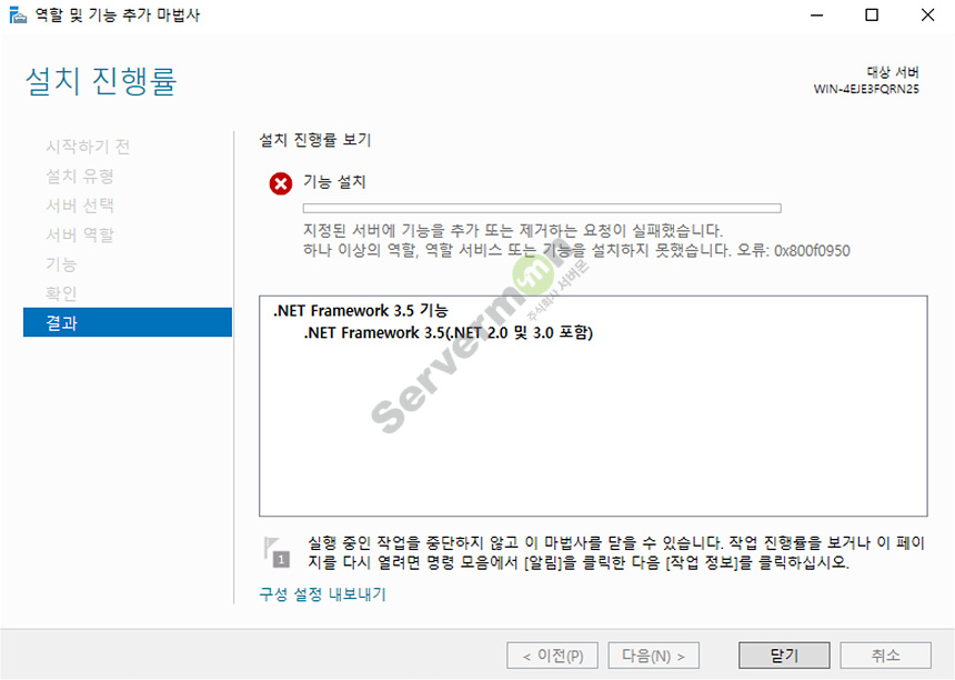 Windows Server 2019에서 닷넷 프레임워크 3.5 를 설치할 경우 온라인을 통한 설치는 불가능하고, Windows Server 2019 설치 CD를 통해 설치를 진행해야 합니다. (온라인으로 설치할 경우 아래 화면처럼 오류 발생)