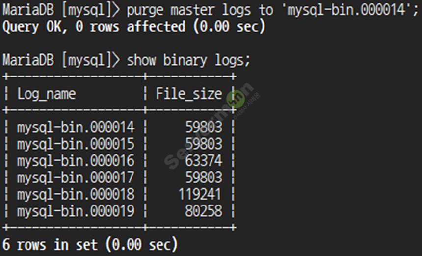 MariaDB [mysql]> purge master logs to 'mysql-bin.000014';