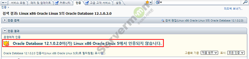 3. 인증결과(Certification Results) 에서 첫번째 사진처럼 Oracle 왼쪽에 초록색 체크가 되면 지원이 가능한것이고, 금지표시로 빨간색이 되어있으면 지원되지 않는것 입니다.