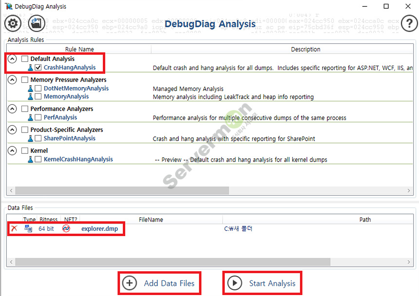 Add Data Files 를 통해 분석할 덤프 파일을 선택하고 Start Analysis 를 클릭합니다.