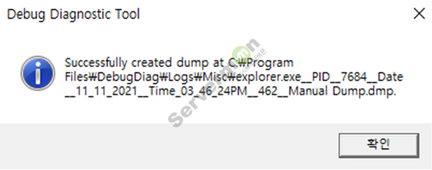 덤프 생성이 완료되면 아래와 같은 팝업창이 발생합니다.