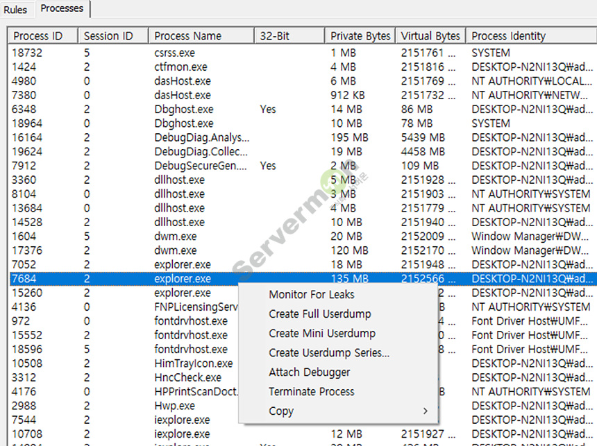 Processes 탭에서 원하는 프로세스에 마우스 우클릭하여 덤프 생성이 가능합니다.