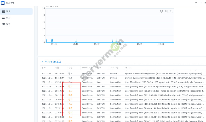 2. 로그 센터에서 로그를 확인하면 하기와 같이 외부의 불법적인 접근 시도 내역을 확인 할 수 있습니다.